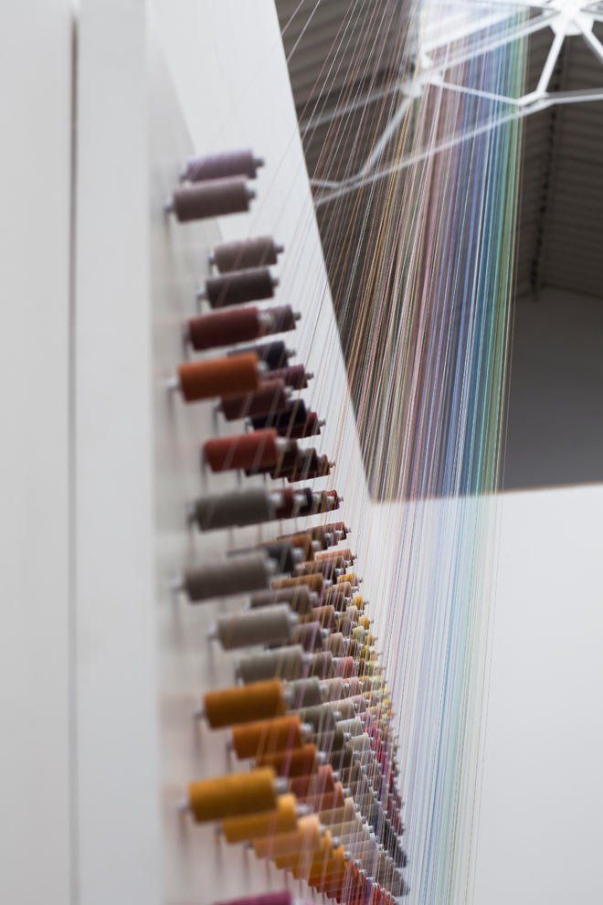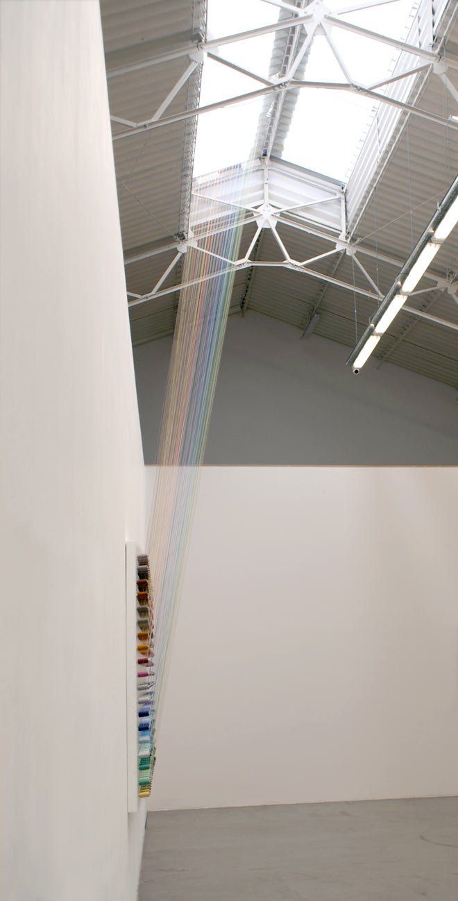 Rainbow or The Ascension Conrete Art. Eine Poesie der Alltagsdinge. 370 farbige Fäden auf Spulen. Von der festen Wand in helle spirituelle Sphären.